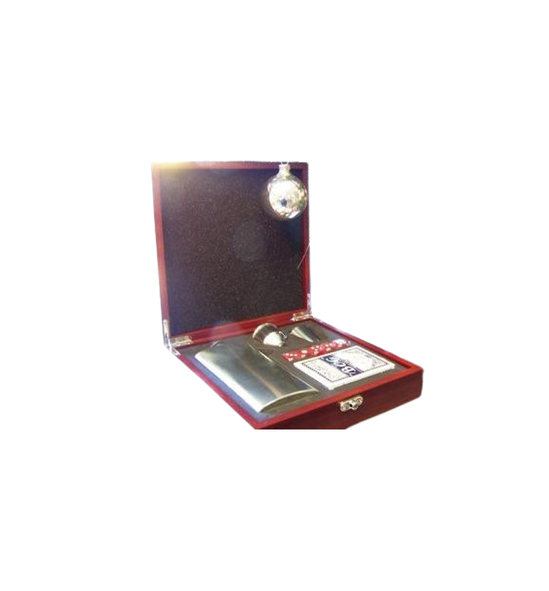 Rosewood finish case holds Flask, Funnel, Shot Glass, Deck of Cards and 5 Dice overall size is 8. 25 x 8. 25 x 2. 25,