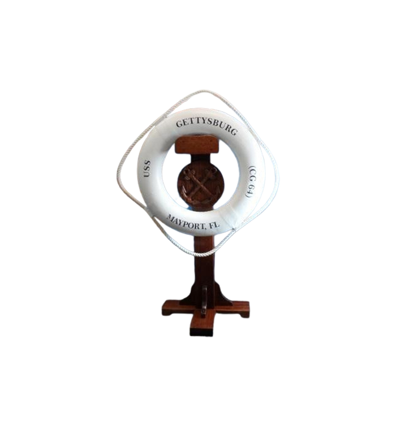 mAHOGANY KISBEE WITH CROSSED ANCHOR HARNESS HOLDS A 20″ LIFE RING WITH SHIP/COMMAND NAME. LIFE RING INCLUDED