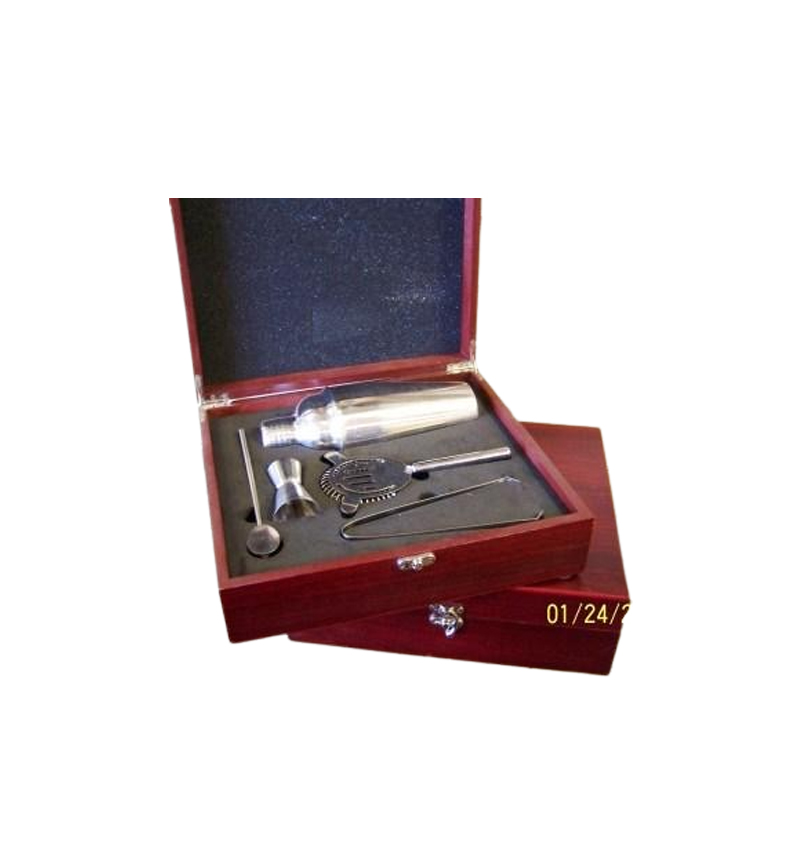 Shaken or Stirred? Make the perfect martini with this bar set. Rosewood case includes stainless shaker, shot glass, tongs, strainer, Add engraving to the top for a personal touch! ($20.00 for four lines)